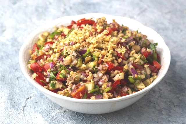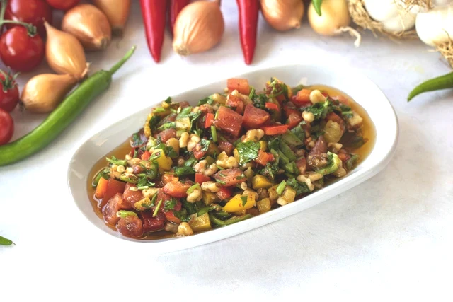 Kuru soğanı ince ince doğrayıp, acının çıkması için biraz tuz ve sumak ile ovun. Domatesleri, salatalığı ve yeşil biberleri de doğrayarak, hepsini geniş bir salata kabında bir araya getirin.