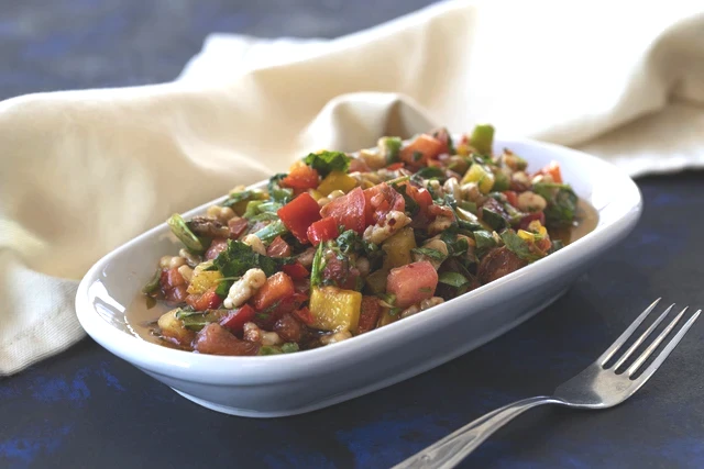 Zeytinyağı, nar ekşisi ve tuzu bir kasede karıştırarak salatanın üzerine dökün. İri kıyılmış ceviz içini de ekledikten sonra malzemeleri nazikçe harmanlayın ve servis tabağına alın.